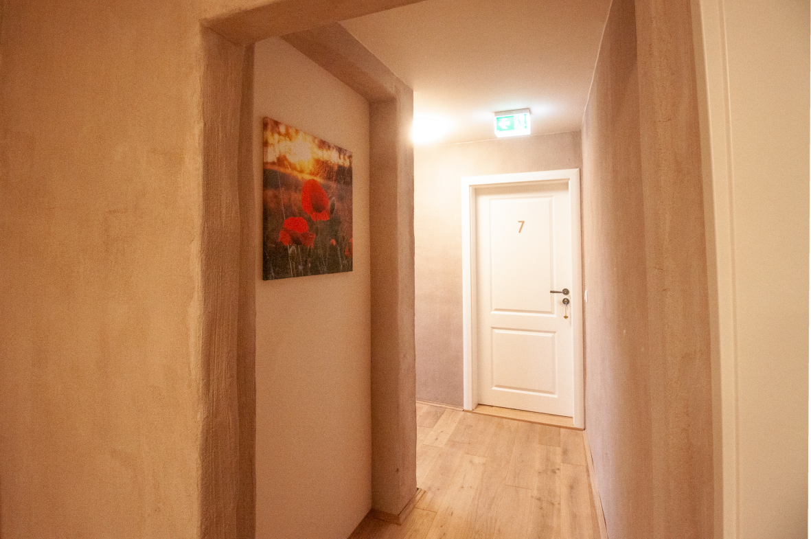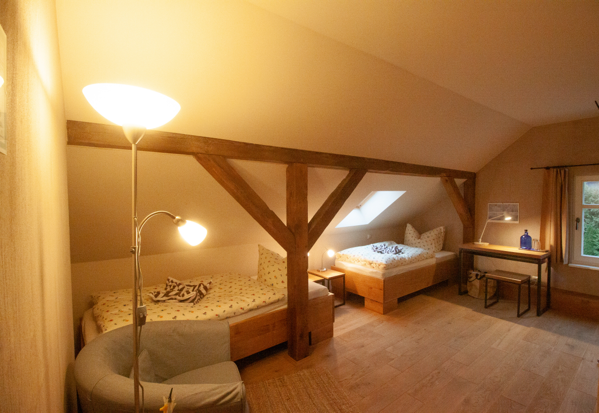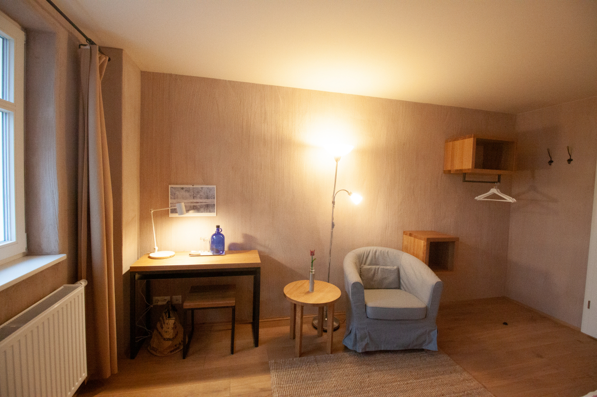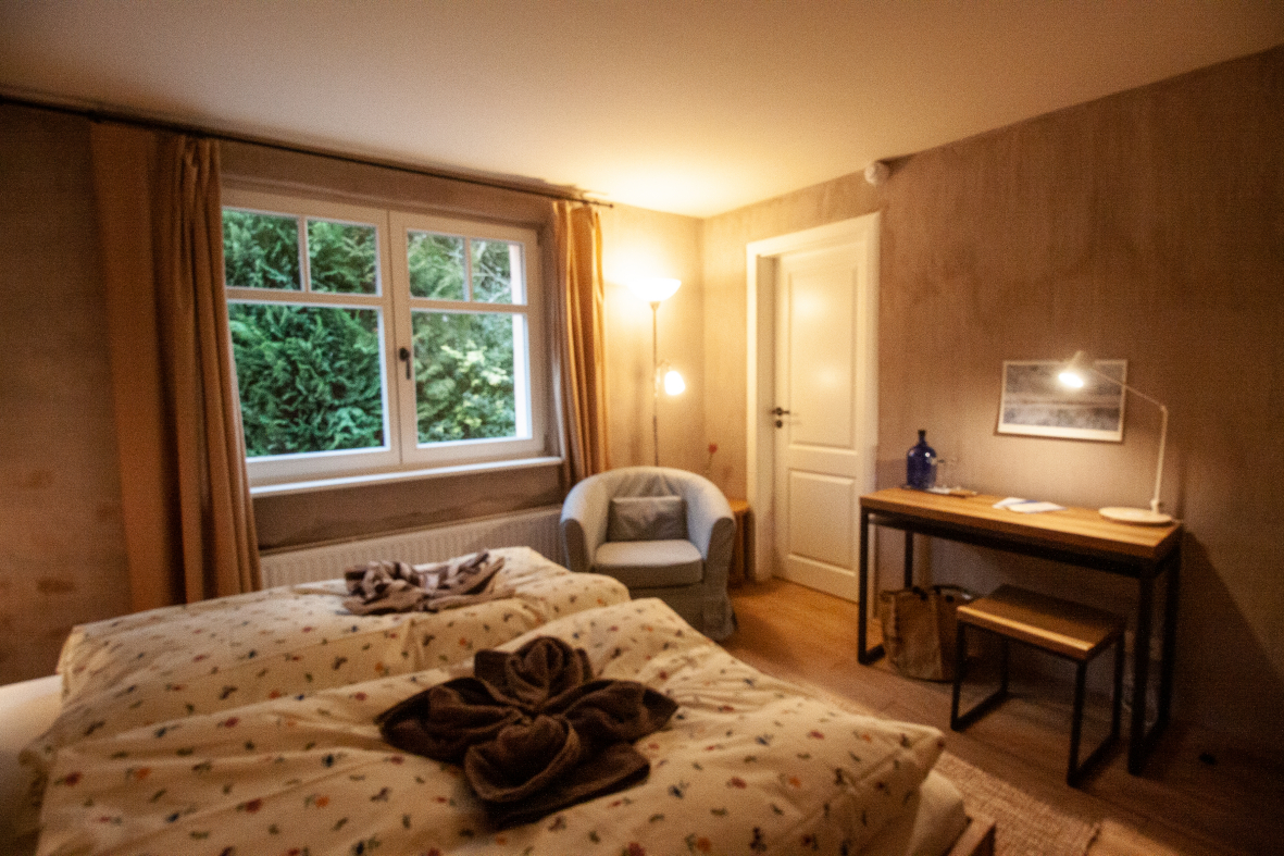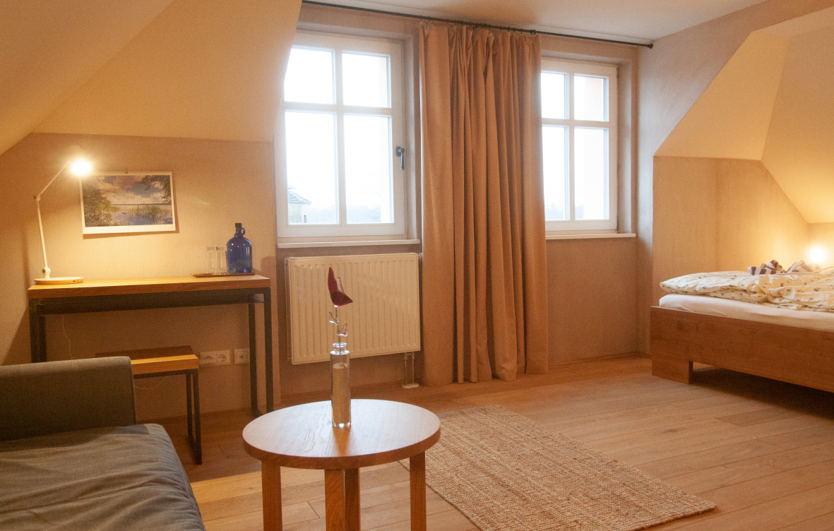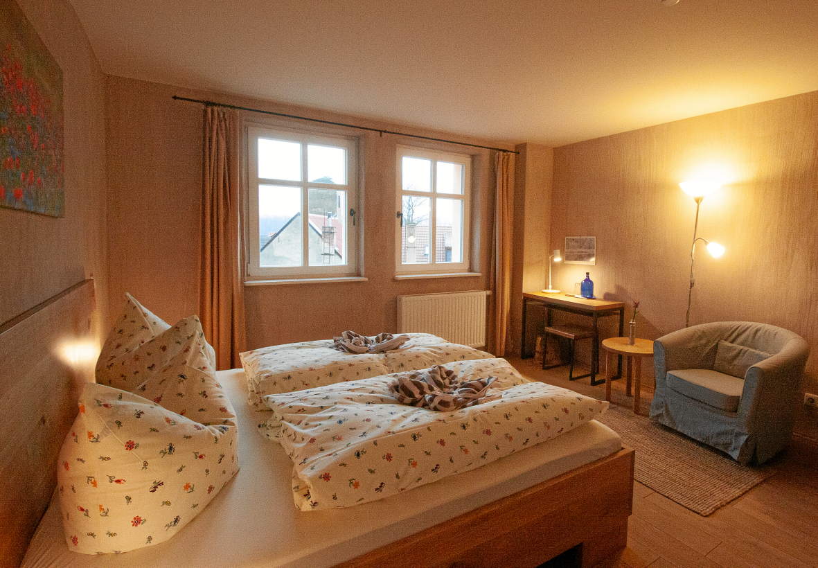 Für umweltsensible Menschen haben wir unsere Zimmer allergikergerecht ausgestattet mit Vollholzmöbeln und Eichenfußboden. Der Innenputz besteht aus Rotkalk, der ähnlich atmungsaktive Eigenschaften aufweist, wie Lehmputz. Bei der Stoffauswahl von Vorhängen und Bettwäsche haben wir ökologische Naturmaterialien gewählt, ebenso wie bei den Teppichen.